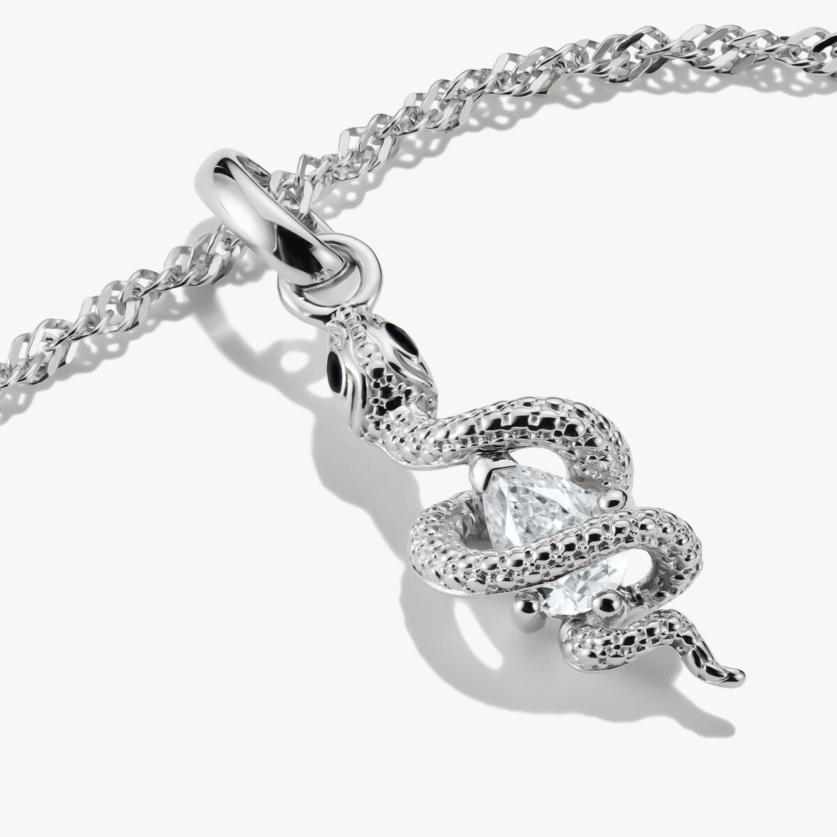 Den betydelsefulla ormen är elegant tolkad i denna berlock tillverkad av återvunnet silver. Den slingrar sig runt en gnistrande, vit droppformad zirkonia och dess ögon lyser i mystisk svart. Ormens kropp är autentiskt modellerad med fina graveringslinjer.