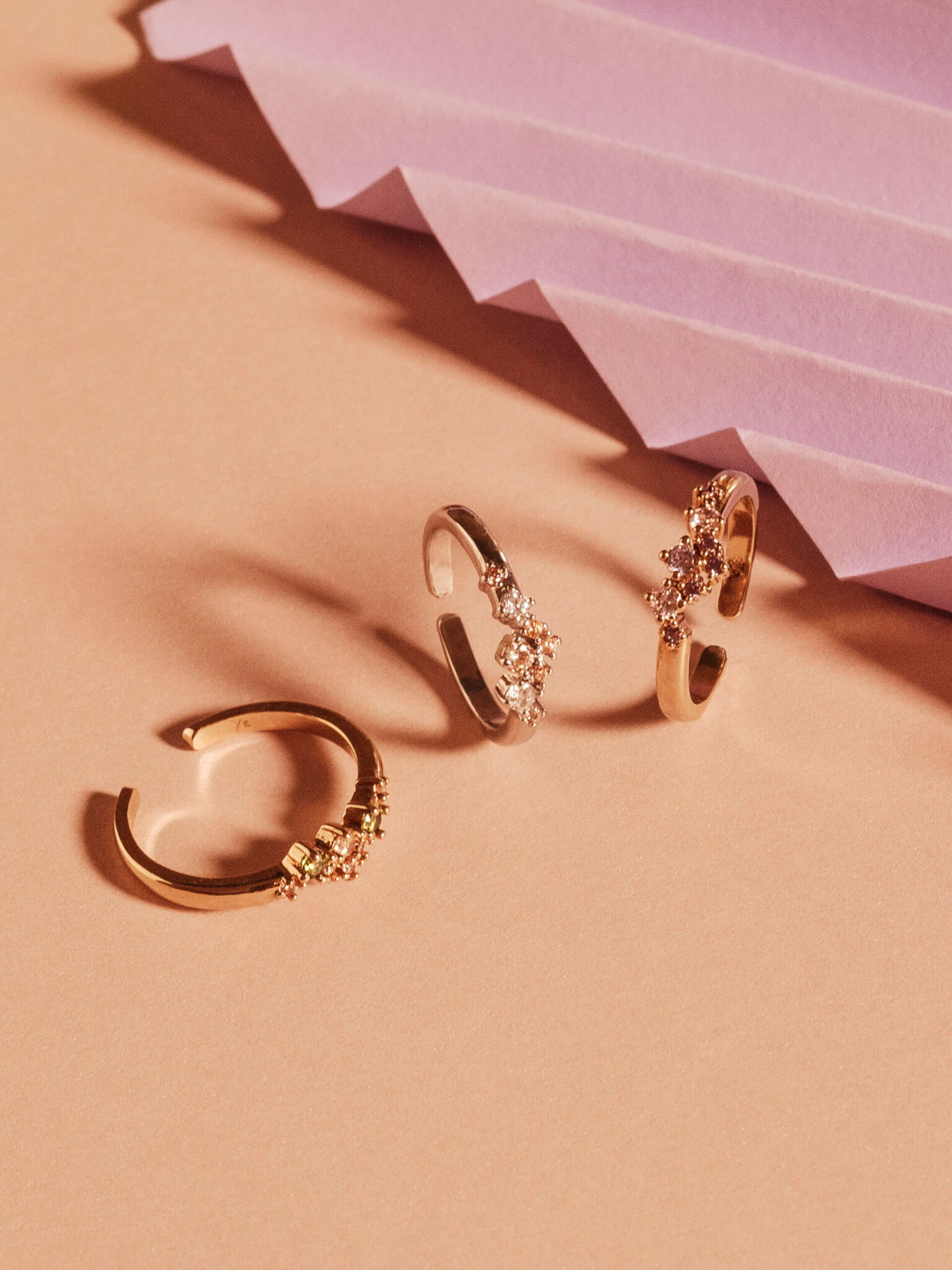 Klassisk justerbar ring i guldpläterad mässing med en kombination av ljusgrön och champagnefärgade cubic zirkonia stenar.