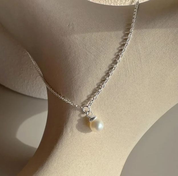 Petite Pearl Single, ett kort silverhalsband med en skimrande vit sötvattenspärla.