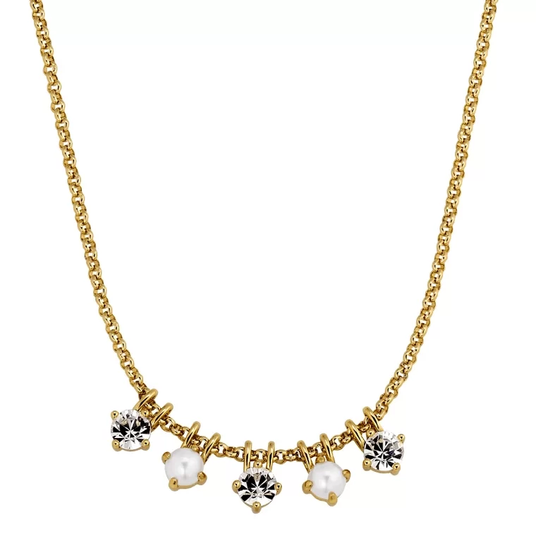 PHILA – ett elegant halsband tillverkat med fem runda facetterade kristaller som hängen. Total längd cirka 42 cm och 5 cm förlängning. Kedjan är tillverkad av rostfritt stål, och hängen är i polerad mässing. Visas här i guldfinish med klara kristaller och vita pärlor. Nickel-fri dansk design.