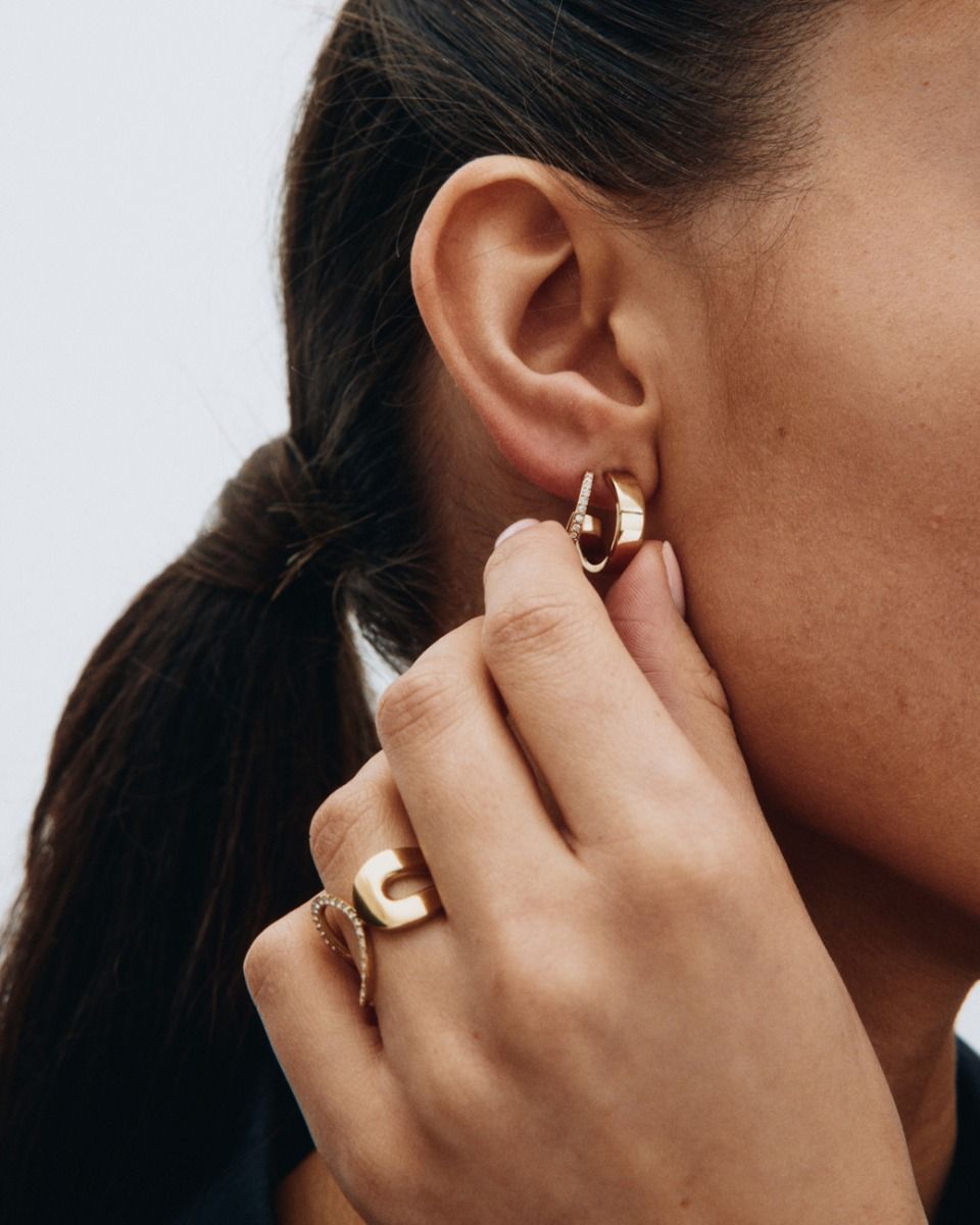 Plié, guldpläterade stålörhängen som sätter fokus på öronen, med nätta men uttrycksfulla och spännande former inspirerade av den klassiska balettpositionen.
