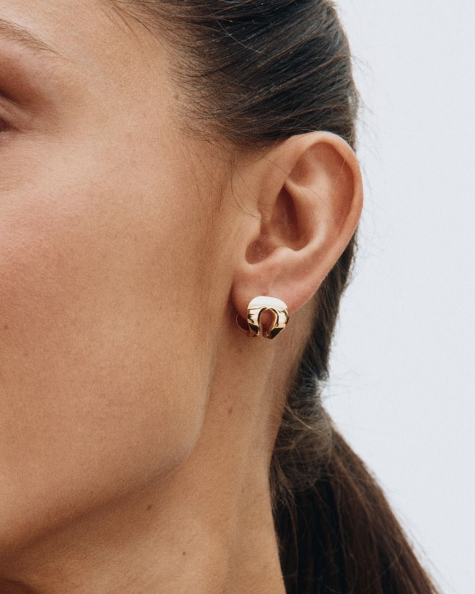 Plié, guldpläterade stålörhängen som sätter fokus på öronen, med nätta men uttrycksfulla och spännande former inspirerade av den klassiska balettpositionen.