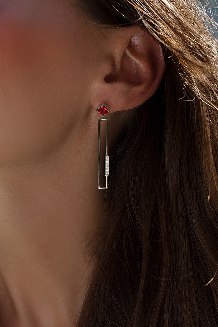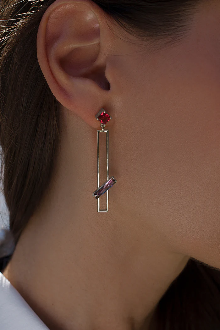 Långa, rektangulära, silverörhängen med ädelstenar i lavendel och fuchsia ton. Matcha med tillhörande ring.