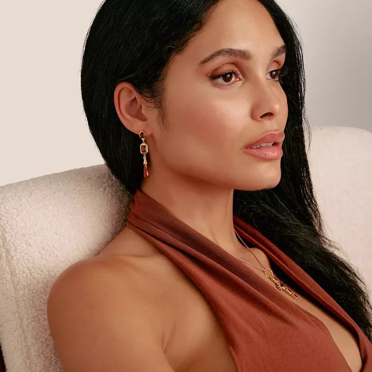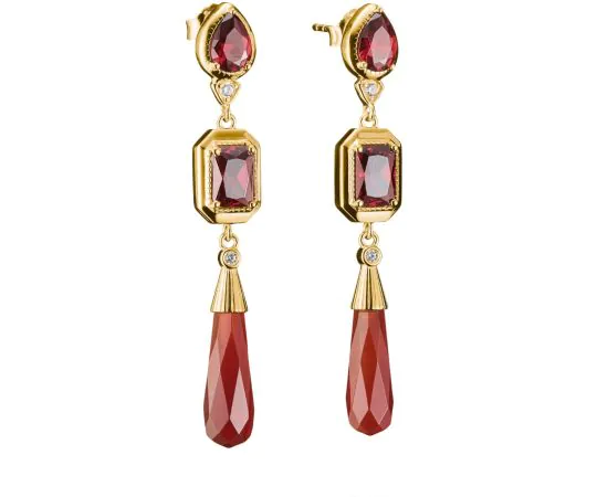 Varm djup möter lysande precision: fasetterade granatröda zirkoner i oktagon- och cabochonslipningar leder blicken till en droppe av röd agat—en symbol för styrka och livskraftig utstrålning. Olika slipningar skapar ett levande spel av ljus och rörelse, medan 18k-förgyllningen ger en exklusiv inramning. Som en del av Elyndra-kollektionen följer detta par dig vid tillfällen som tryggt förenar styrka, sensualitet och stil.