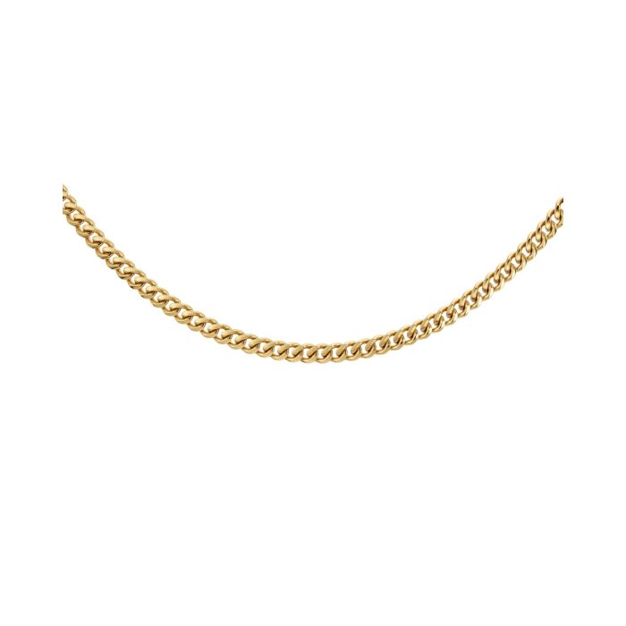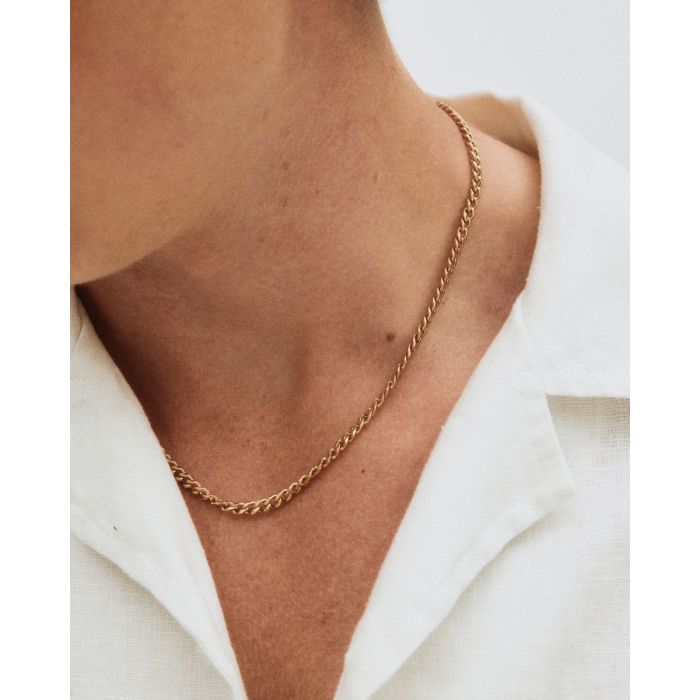 Halsbandet i serien Riley är en kraftig pansarkedja, här i blank 14K guldpläteringl. Lika snyggt att bära i lager tillsammans med andra favorithalsband som för sig, och en uppskattad gåva. Snyggt att kombinera med seriens armband. 50 cm.