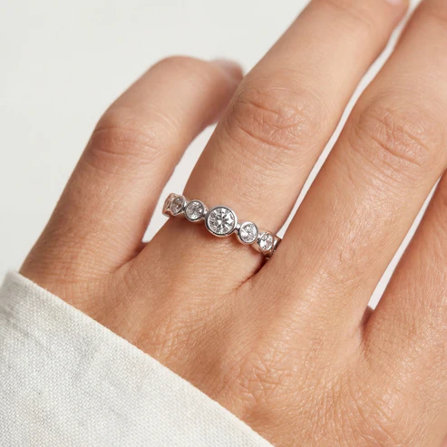 Ring i 925 Sterling Silver med polerad yta och handfattade, fasettslipade vita zirkoner.