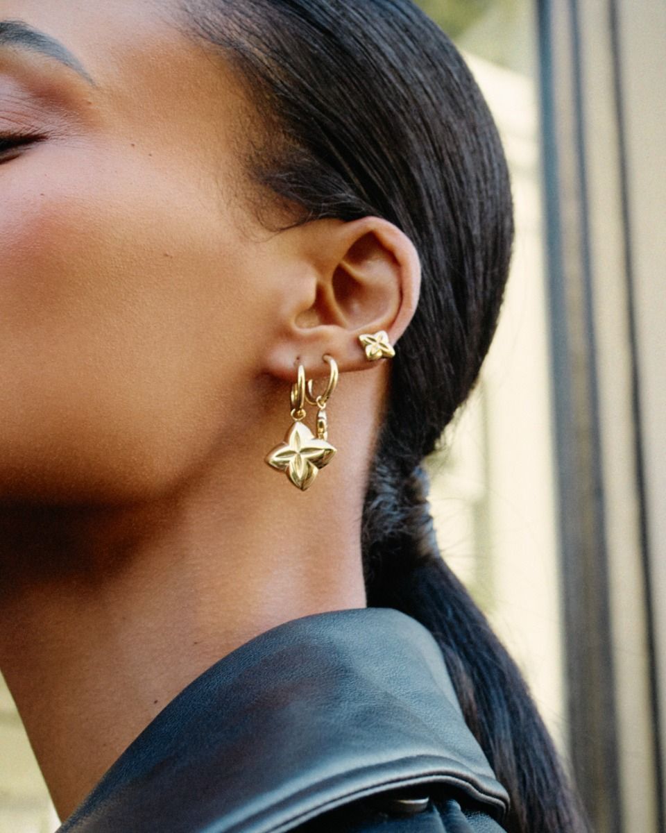 Scala, guldpläterade stålörhängen med en stiliserad blomform inspirerad av klassiskt kakel med fasetter som fångar ljuset och glänser vackert i öronen.