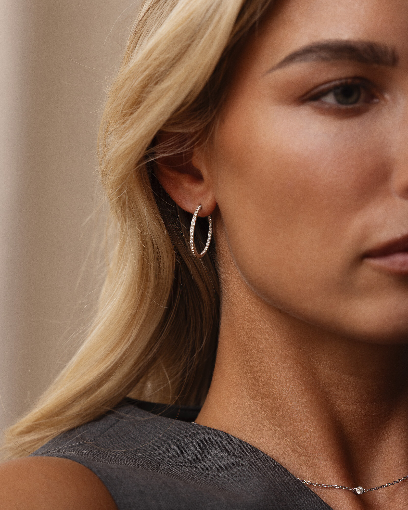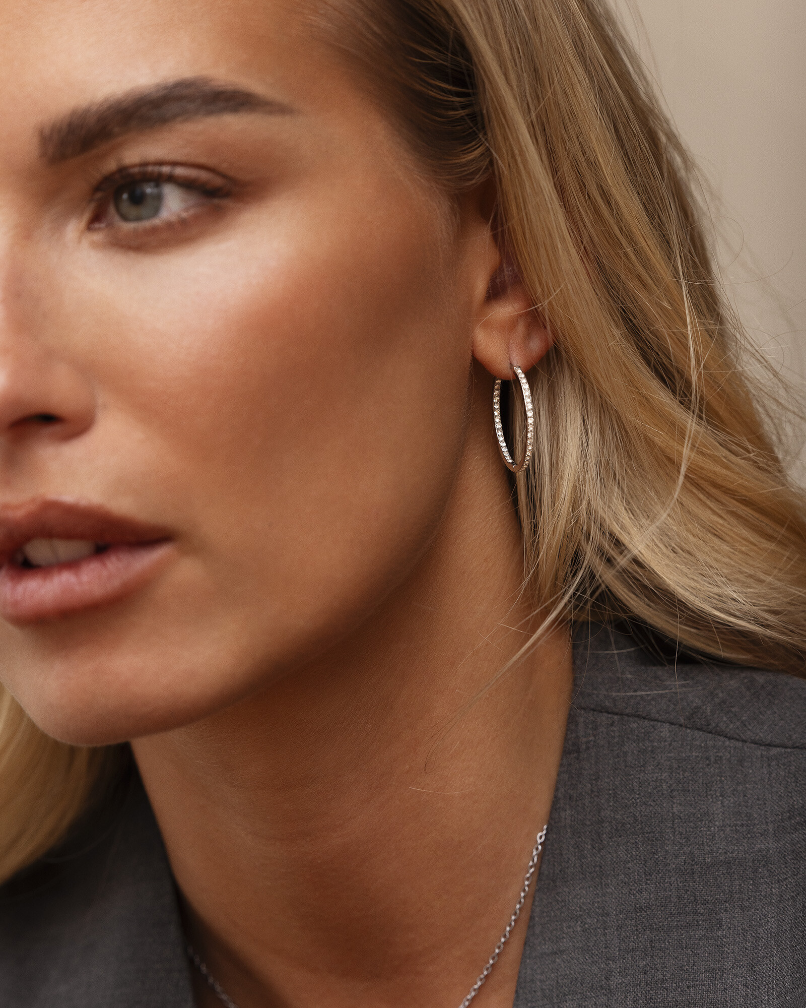 Sparkle Hoops glimmar mjukt i silverfärgad ton. De smala creolerna pryds av Cubic Zirconia som fångar ljuset vid varje rörelse. Lätta att bära, lätta att matcha – från vardag till kväll.