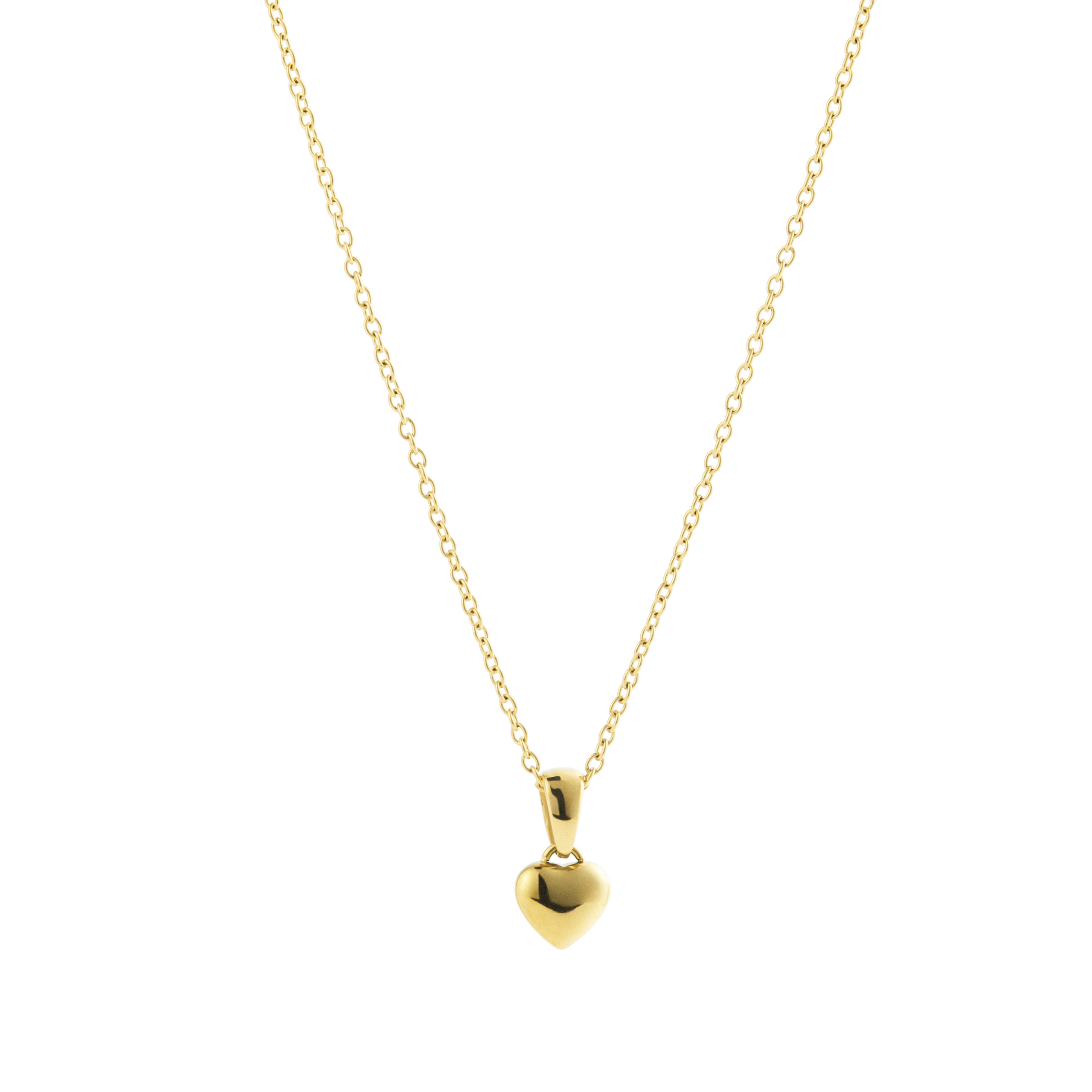 Ett guldpläterat halsband i stål med ett hjärthänge i mellanstorlek, skapat för att symbolisera kärlek med en modern känsla. Tidlöst, elegant och gjort för att bäras nära varje dag.
