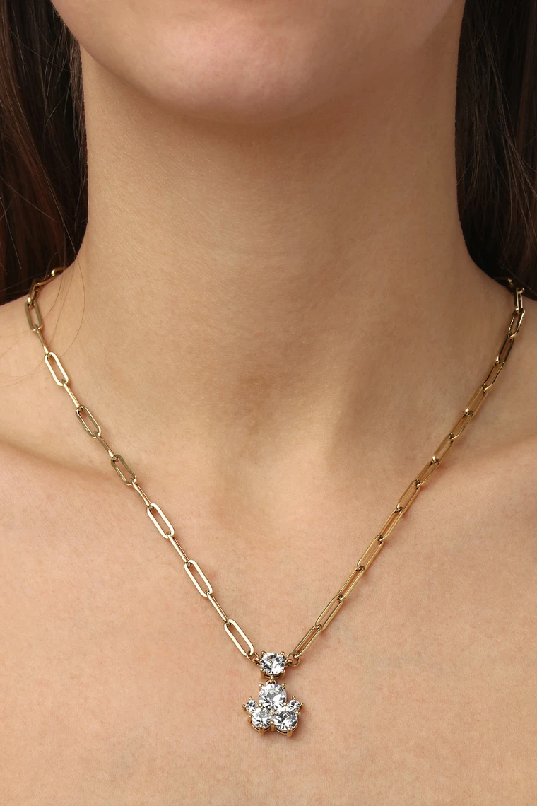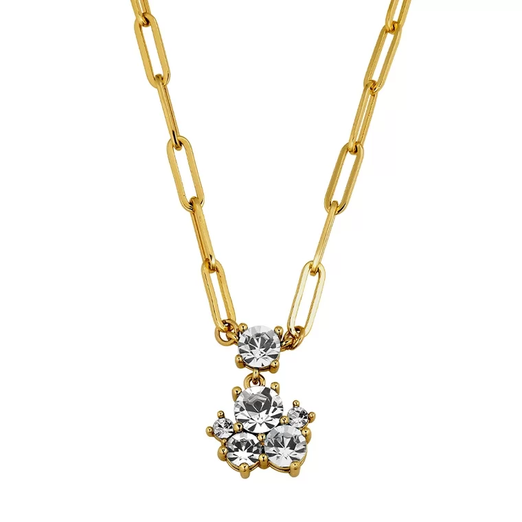 TANZY – ett elegant halsband, där pendeln har flera kristaller i olika storlekar. Total längd cirka 45 cm och 5 cm förlängning. Kedjan är tillverkad av rostfritt stål, och hängen är i polerad mässing. Visas här i guldfinish med klara kristaller. Nickel-fri dansk design.