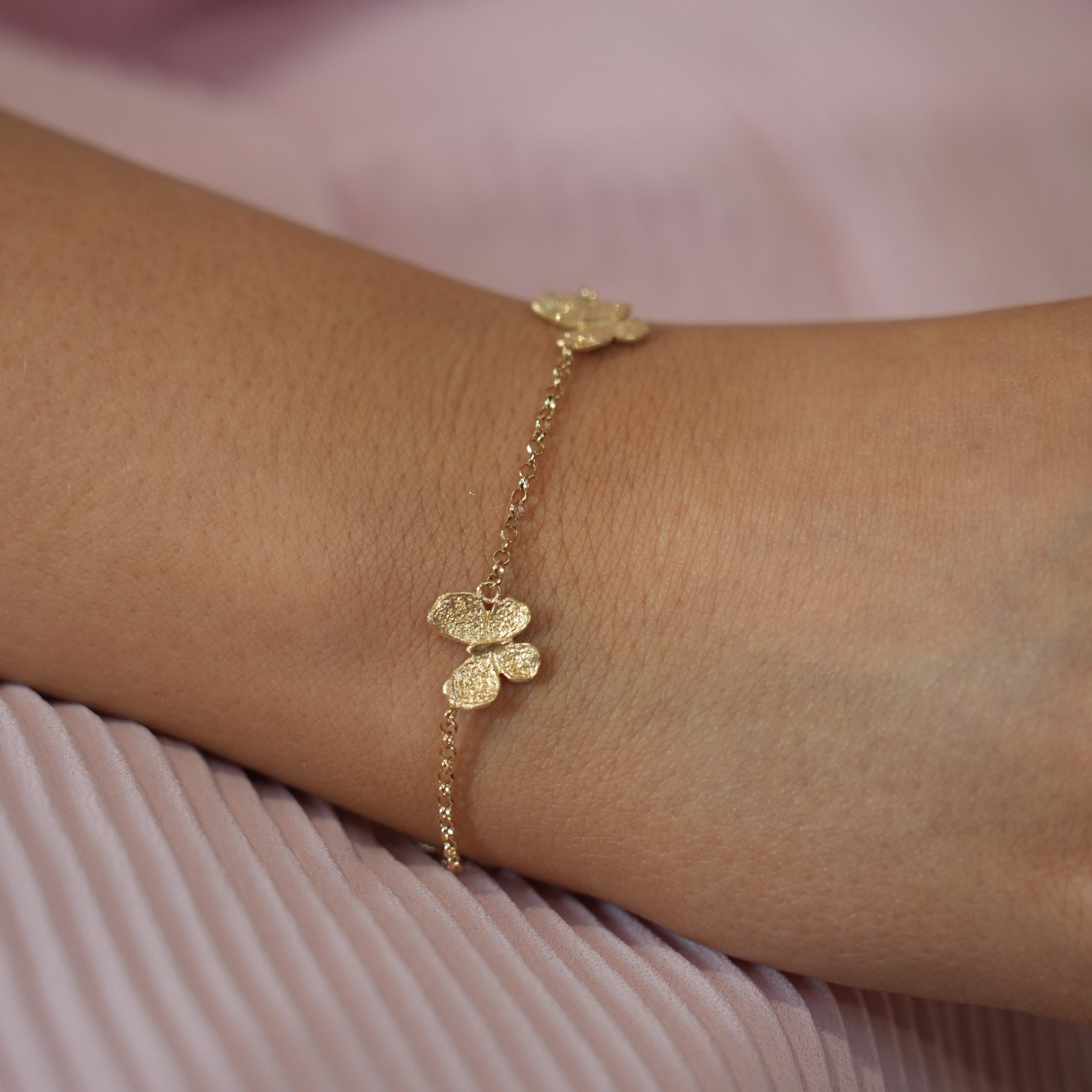 Vackert armband med tre fjärilar i återvunnet 925 förgyllt silver.