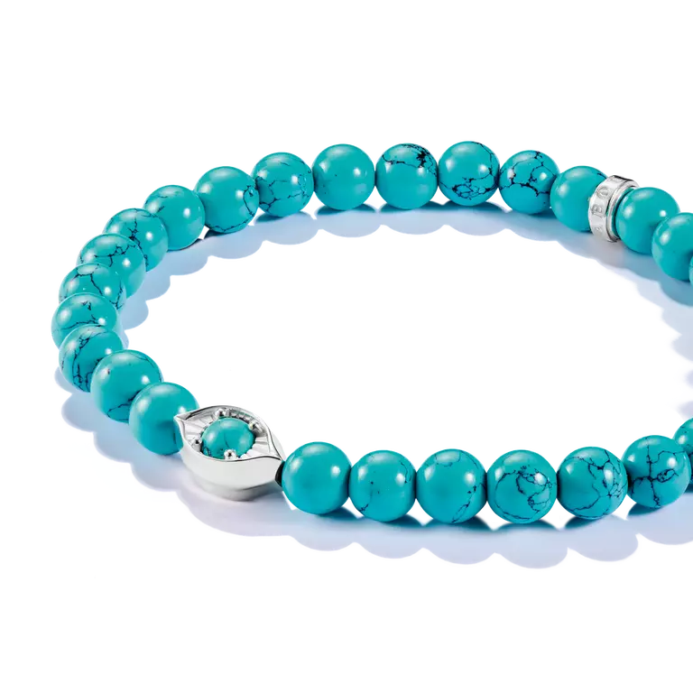 Ett armband fyllt av beskyddande energi: släta polerade imiterade turkospärlor ligger i harmonisk rad och ramar in ett konstfullt utformat silverinslag i stiliserad ögonform, accentuerat med en extra turkossten. Denna meningsfulla design står för klarhet, helande och inre balans. Som en del av Elyndra-kollektionen följer detta smycke dig som en stilfull talisman med djup och uttrycksfull kraft.