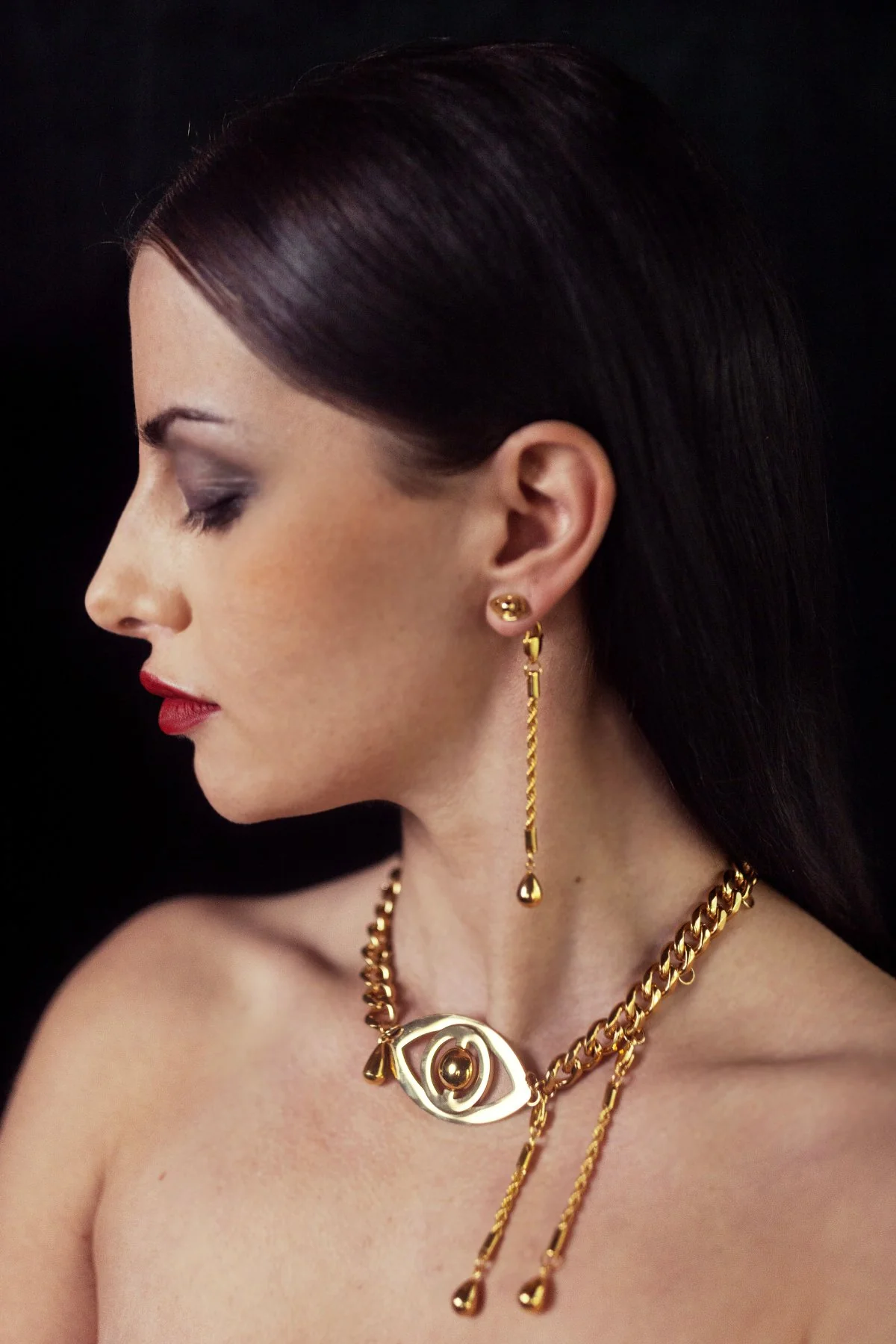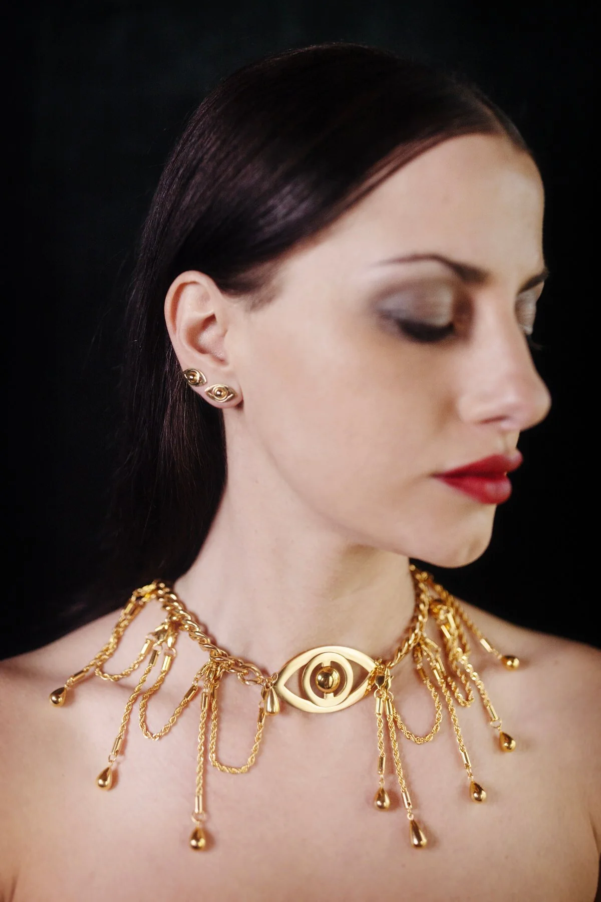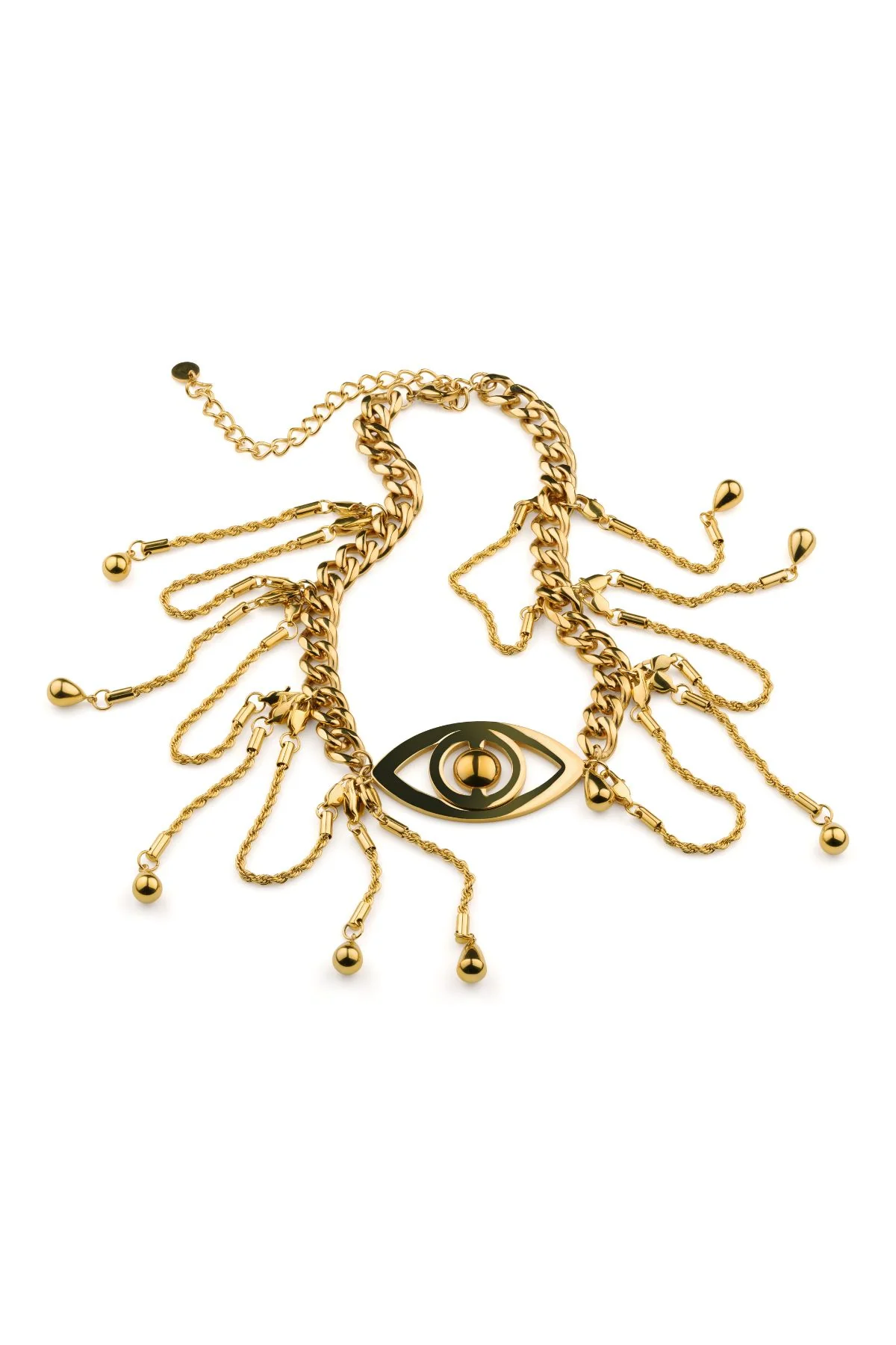 Voyance, guldpläterat stålhalsband med ett magnifikt öga i centrum, vaksamt och levande. Två kontrasterande kedjor möts i ett kraftfullt uttryck, med tårar som faller i skimrande rörelse.